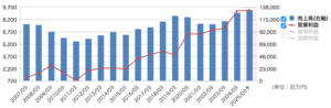 株価は、長期的には右肩上がりで2024年に急上昇してます。