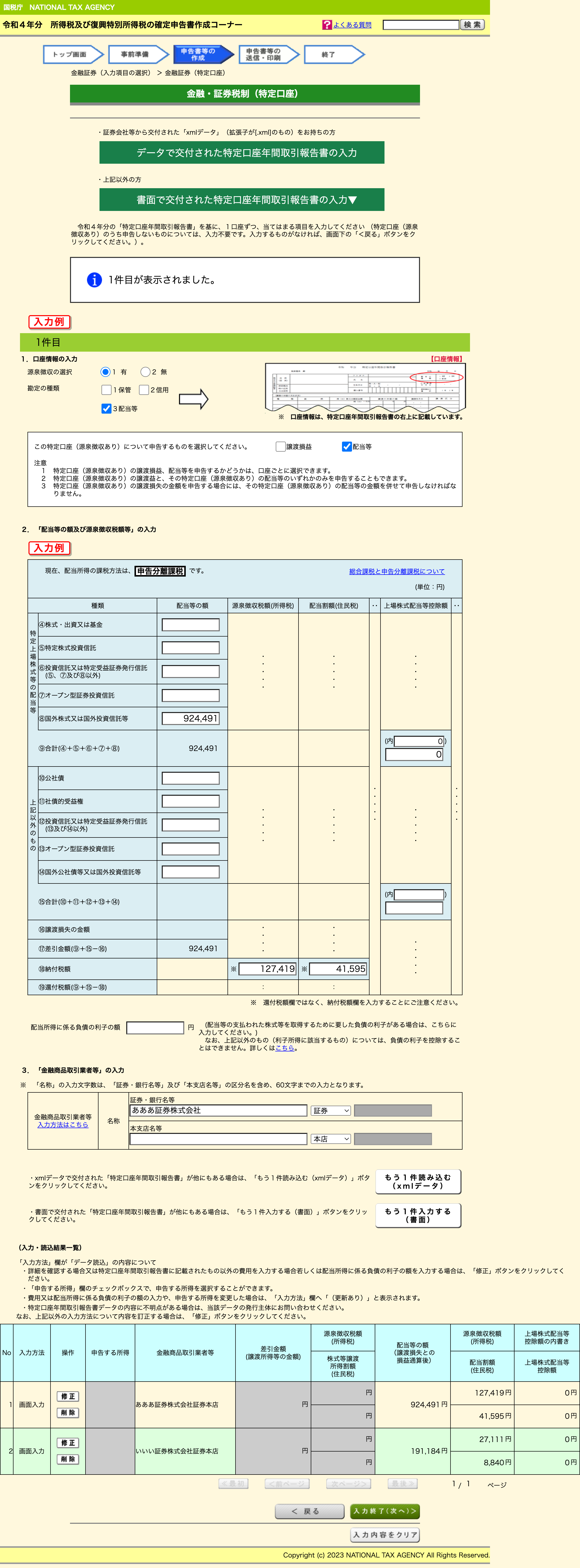 相手国の課税標準:特定口座年間取引報告書or配当等の年間支払通知書に記載の配当所得額